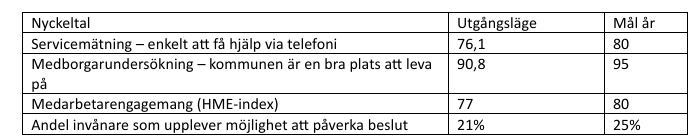 gemenskap och en hållbar framtid. Kommunens mål ska bidra till hög livskvalitet, stärkt välfärd och en långsiktigt hållbar ekonomi. Målen är i huvudsak relaterade till relevant statistik i Kolada.