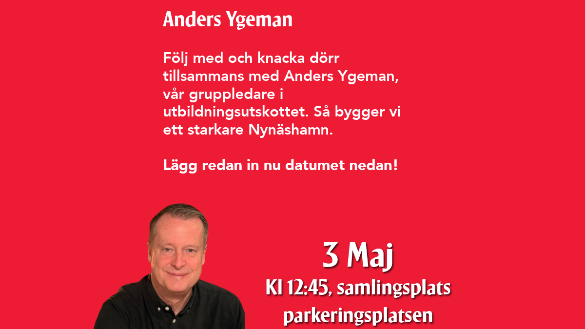 Knacka dörr med Anders Ygeman 03 maj 12:45 - 14:30 Samling kl 12,45 Gröndalsviken parkeringsplatsen Facebook Twitter Email Share page